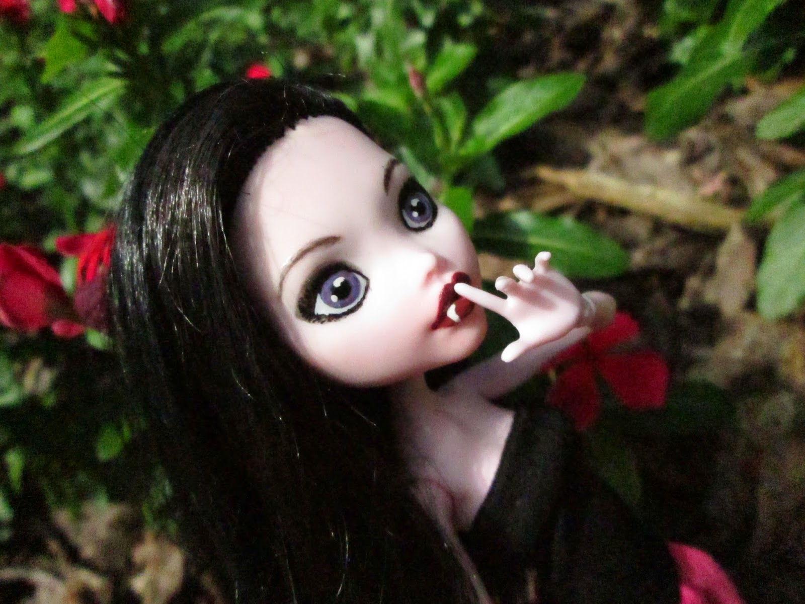 When repainting I initially painted her eyes a dark brown, but it looked awful (real dingy and boring) so I changed it back to her fantasy shade of purple. I gae her shimmering silver eye-shadow, delicate eyelashes and intricate eyebrows (that, though you cant see much in these pics, are painted hair by hair). I then painted her lips a dark cherry red (or blood red--Hehe) and added some killer fangs. AND NOW SHE'S DONE!!!